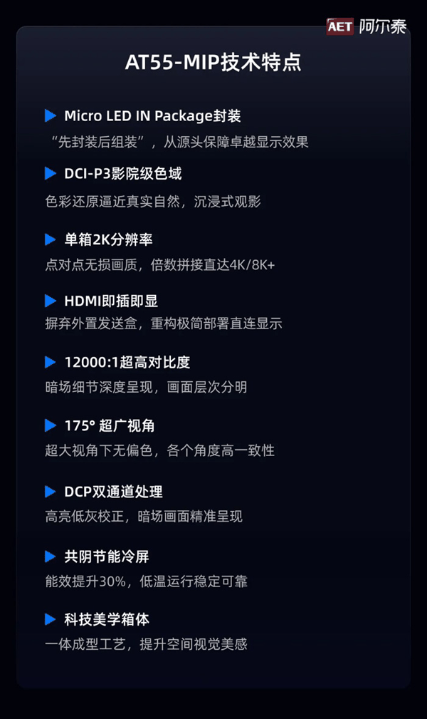 AET阿尔泰正式发布AT55-MIP领创显示平台,以"技术更优、画质更优、应用更优"实现全维迭代,倾力打造Micro LED超高清显示的更优解决方案。