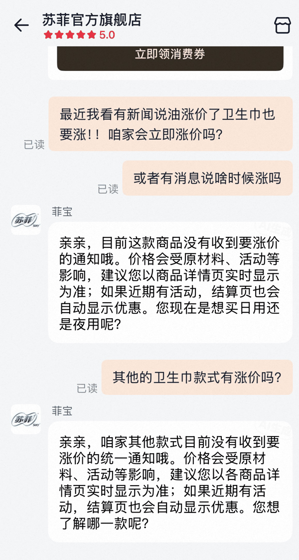 苏菲官方旗舰店客服表示,目前店内各类卫生巾没有收到要涨价的通知。价格会受原材料、活动等影响,建议以商品详情页实时显示为准。如果近期有活动,结算页也会自动显示优惠。