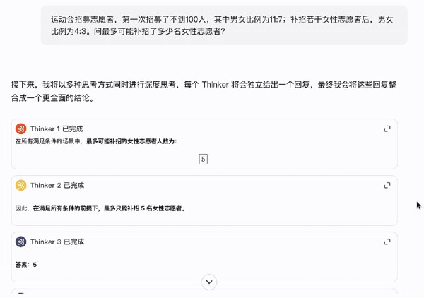 大部分 Thinker 给出了答案 5,其中 3 号和 6 号 Thinker 还写出详细的推导过程。待 8 个 Thinker 执行完任务后,模型再验证不同 Thinker 的思考过程,形成最终答案。
