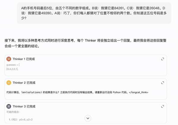 在 longcat.ai 上开启「深度思考」后,便进入了重思考模式,此时 8 个 Thinker 同时开工,每个都表现出不同的思考风格。有的按常规解题,有的则直接写了个 Python 脚本。