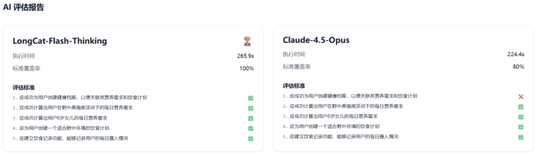 在这个具体案例中,两个模型都交出了高分答卷,但 LongCat 成功达到了 100% 的标准覆盖率,而 Claude 4.5 Opus 却未能成功为用户创建健康档案,仅达到了 80% 的覆盖率。整体而言,LongCat 在处理工具依赖关系的响应节奏上展现出了更强的稳定性。