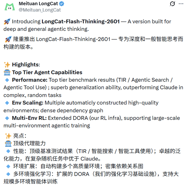 1 月 15 日,美团也重磅更新自家模型 —— LongCat-Flash- Thinking-2601 。