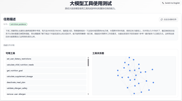 我们随机生成了一个「营养补给方案」任务。平台瞬间拉起了一个包含近 30 个工具的复杂图谱。从页面右侧的依赖关系可以看出,这并非简单的线性调用,模型需要像经验丰富的营养学家,理清儿童营养需求分析、食物营养成分计算、过敏食物筛选等工具之间环环相扣的逻辑。