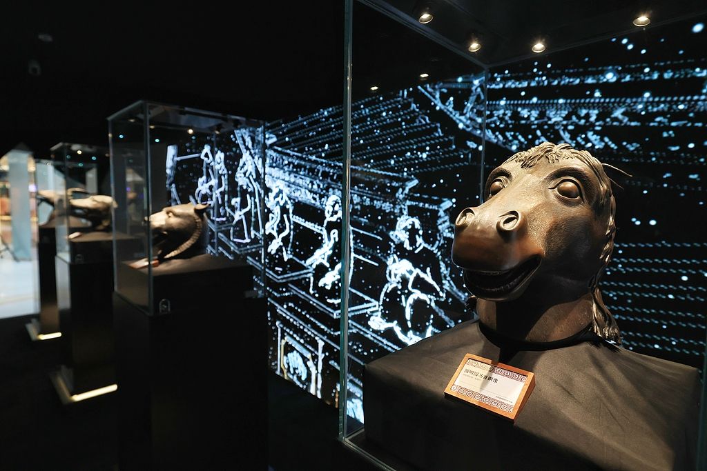 2025年12月23日,“兽首迎新 海晏河清——圆明园文化艺术展”在北京某商业空间面向公众开放。图为圆明园文物回归形象大使、演员成龙捐赠的十二生肖铜像复制品。视觉中国丨图 捐赠文物在博物馆藏品中有多重要