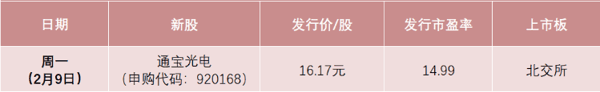 根据目前的发行安排,本周只有1只新股申购,即周一(2月9日)的北交所新股 通宝光电 。