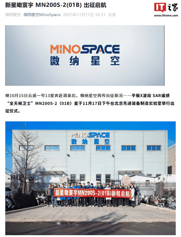 IT之家 11 月 17 日消息,继 10 月 15 日云遥一号 13 星奔赴酒泉后,微纳星空今日宣布, 平板 X 波段 SAR 遥感“全天候卫士”MN200S-2(01B)星 于今日下午在北京先进装备制造实验室举行了出征仪式。