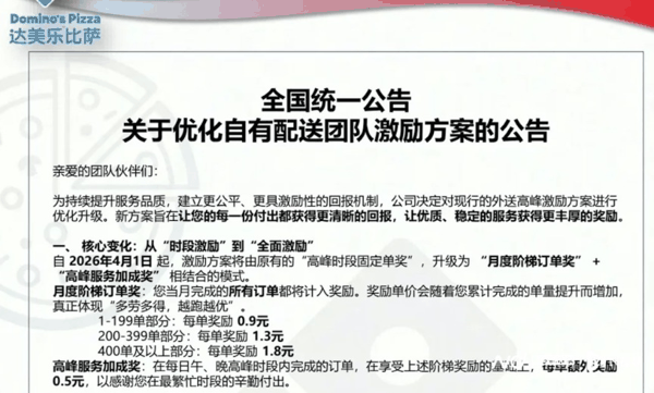 对于调整原因,达美乐在公告中指出,为感谢伙伴们全天的付出而不仅是简单的忙碌,公司优化了激励结构。新方案让全天每笔订单都有价值,且跑得越多、奖励单价越高,旨在更公平、更快地回报稳定、优质的配送服务。达美乐称,新方案的设计目标并非降低骑手收入,而是优化激励结构。对于提供稳定、优质服务的骑手,总收入将更有保障。