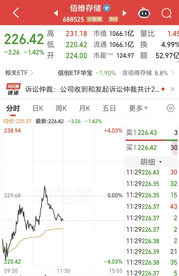 4月9日, 佰维存储 股价震荡走跌。 截至上午收盘, 其股价下跌1.42%,报226.42元/股,市值为1066亿元。