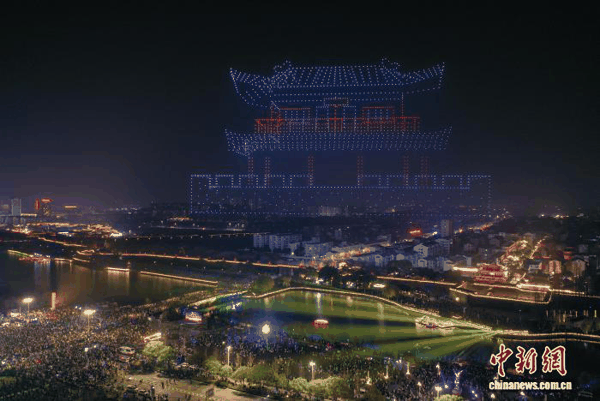 1月1日晚,“荆州十二时辰”主题无人机光影表演在湖北荆州古城上演。(无人机照片)叶力铭 摄
