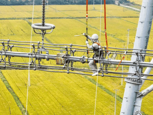 国网江苏超高压公司利用无人机+电动升降机等设备,对1000千伏淮南-南京-上海特高压交流输变电工程盱泰线进行维护。图片来源:国网江苏省电力有限公司