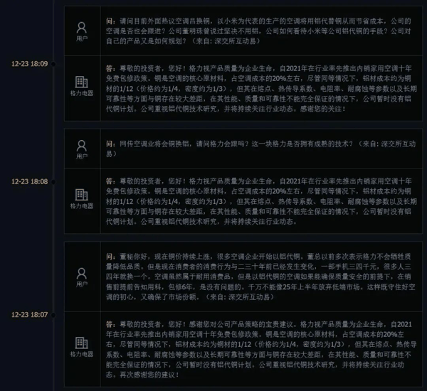 月底的时候,格力又在互动平台明确表示,公司暂时没有铝代铜计划。