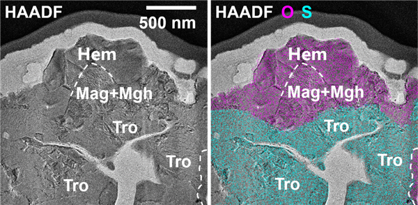 左图是使用透射电子显微镜(TEM)拍摄的赤铁矿晶粒的高角度环形暗场像(HAADF),右图是使用两种特征元素区分的铁氧化物(氧元素,品红色)颗粒和陨硫铁(硫元素,青色)颗粒的接触关系