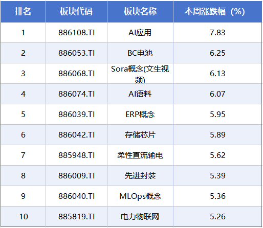 板块方面,本周涨幅居前的概念板块分别是AI应用、BC电池、Sora概念(文生视频)、AI语料、ERP概念,累计涨幅分别为7.83%、6.25%、6.13%、6.07%、5.95%。