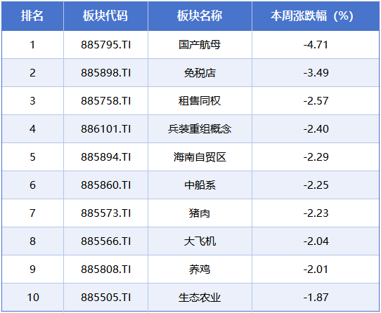 本周排在跌幅榜前排的概念板块分别是国产航母、免税店、租售同权、兵装重组概念、海南自贸区,累计跌幅分别为4.71%、3.49%、2.57%、2.4%、2.29%。