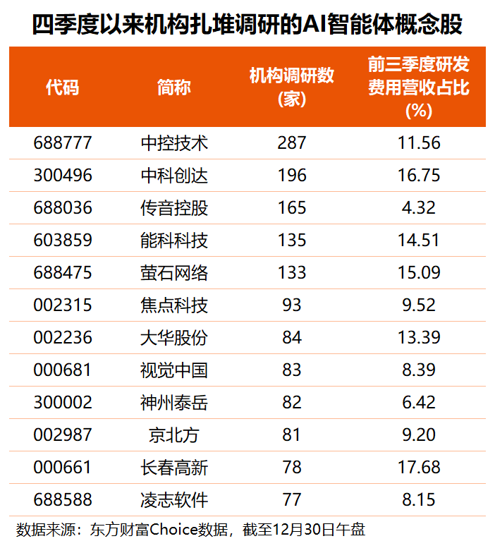 四季度以来,有28只AI智能体概念股获得20家以上机构调研,其中,机构关注度最高的是 中控技术 ,共计287家机构前往调研; 中科创达 、 传音控股 、 能科科技 、 萤石网络 的机构调研数均超百家, 大华股份 、 视觉中国 等5股也有80家以上机构给予关注。