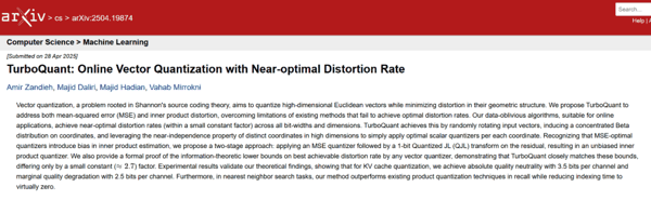 值得注意的是,压缩KV cache、进行长上下文优化也并不是全新的技术思路。早在2025年4月,谷歌就曾公开发表过TurboQuant的相关论文。