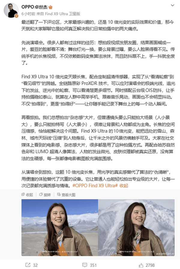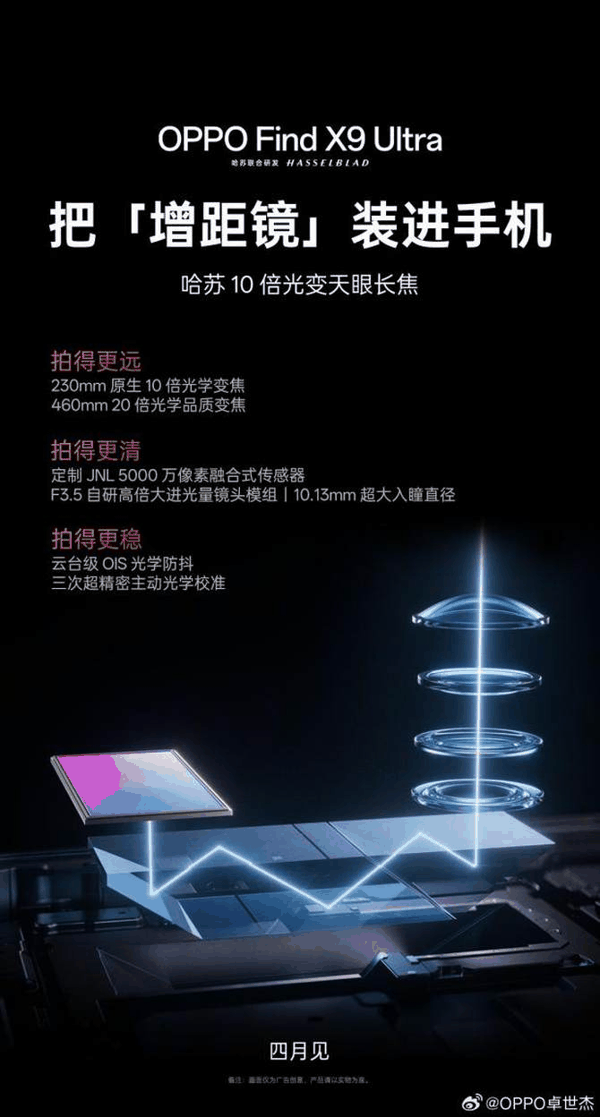 当前手机影像行业内卷已进入技术深耕阶段,长焦镜头作为高端旗舰的核心差异化配置,早已成为各大厂商的竞争阵地。但长期以来,行业陷入“唯倍率论”误区,部分厂商盲目堆砌变焦参数,却忽视用户真实拍摄痛点,导致多数手机长焦沦为“参数好看、实用不足”的噱头,难以实现从“能拍到”到“拍得好”的跨越。4月7日,OPPO Find系列产品负责人卓世杰通过官方微博,详细拆解了Find X9 Ultra 10倍光变天眼长焦的核心技术,其同系列机型Find X9s Pro也同步曝光,两款机型的完整配置将在4月21日19:00的新品发布会上全面揭晓,值得行业与消费者重点关注。