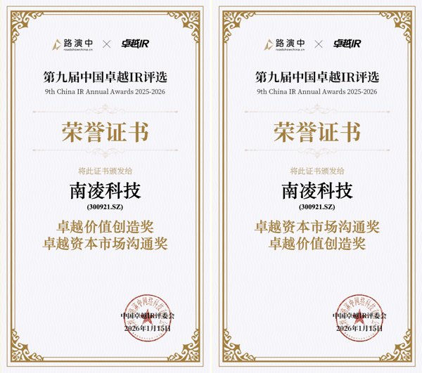 近日,第九届中国卓越IR年度评选结果正式公布。南凌科技 成功摘得“卓越资本市场沟通奖”与“卓越价值创造奖”两项殊荣 。此次获奖,标志着公司在投资者关系建设、信息披露质量及长期价值传递等方面,获得了资本市场的权威认可。