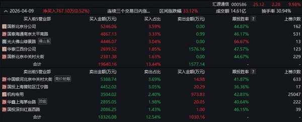 4月9日盘后龙虎榜数据显示,汇源通信股价在创出25.12元/股历史新高的同时,换手率高达惊人的30.94%,14.6亿元的成交额背后,是资金巨大的分歧。 一方面,以“佛山系”( 光大证券 佛山绿景路)、南京太平南路为代表的各路活跃游资仍在继续推高股价,买入榜前五席位大举买入近2亿元;另一方面,高位撤退的暗流已经涌动,一家机构专用席位毫不犹豫地抛售了3504万元,更有北京 中关村 大街、上海茅台路等知名游资席位在反手大额派发筹码。
