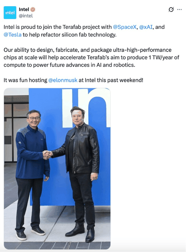 头部 半导体 制造商 英特尔 的加入,让马斯克的Terafab项目执行可信度与产业吸引力大幅提升。