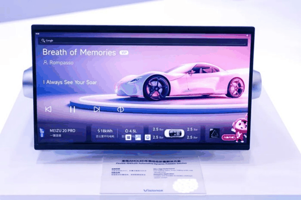 维信诺首次展出系列车载显示新品:在形态层面,维信诺柔性AMOLED车载动态折叠解决方案通过内折半径仅3mm的柔性技术,让中控屏实现“用时展开、闲时收纳”,并已通过超10万次折叠测试;