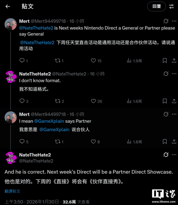 IT之家 1 月 30 日消息,知名爆料人 NateTheHate 今天在 X 平台回应道,任天堂下一场直面会将以合作伙伴展示会的形式进行, 主要展示第三方游戏 。