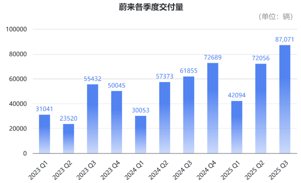 今年第三季度,蔚来交付量为 87071辆车 ,同比增长40.8%,环比增长20.8%。