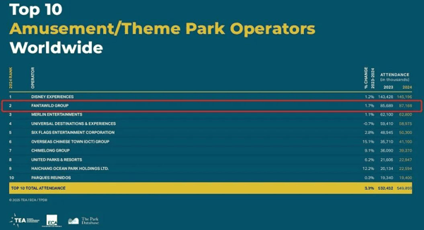 据TEA数据,2024-2025年,华强方特主题乐园的游客接待量,均位居全球第二,仅次于 迪士尼 。