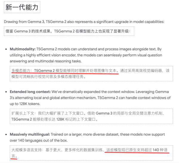 一个是 T5Gemma 2,一个专门的底层架构创新,首个多模态长上下文码器-解码器模型开源,最小是 270M–270M。