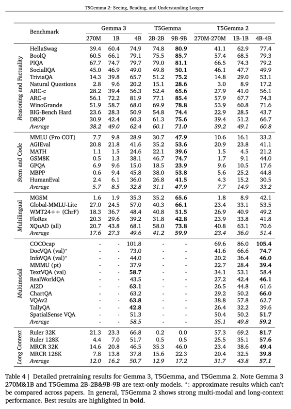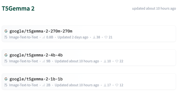 谷歌开源了 T5Gemma 2: 270M–270M、1B–1B 以及 4B–4B 三种规模的预训练模型。