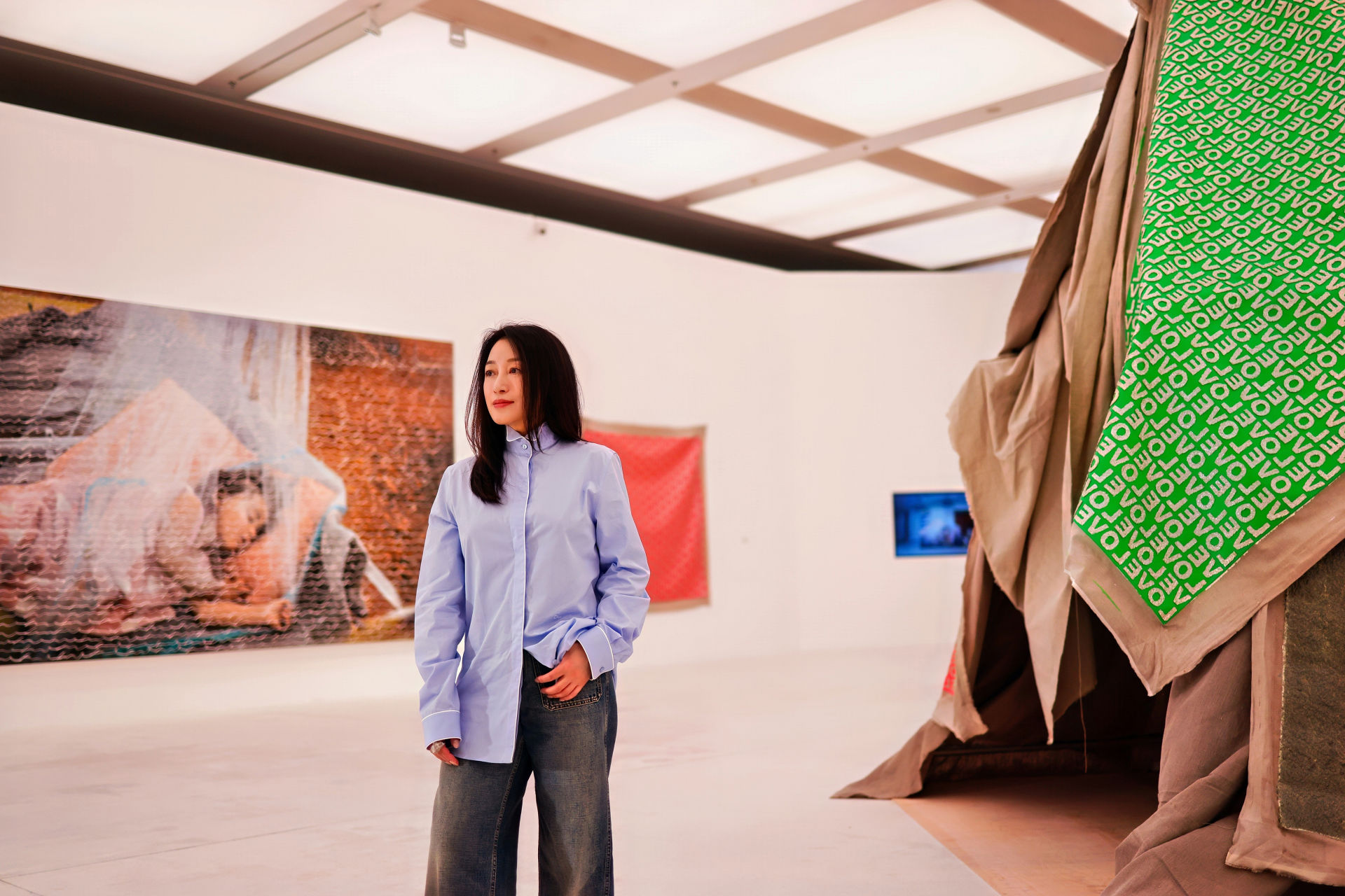 跨界艺术家艾敬在第三单元展厅与装置作品《美丽的屏障》和架上作品《睡在帐篷里的小女孩》