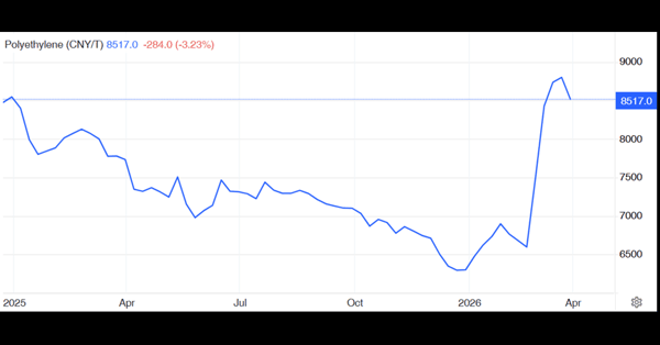 2026年2月28日美以伊冲突爆发后,霍尔木兹海峡 航运 受阻,国际油价快速上涨,影响迅速传导至聚烯烃市场。根据 上海钢联 旗下的隆众资讯,3月国内聚乙烯市场价格经历“急涨-急跌-高位震荡”的走势,3月18日价格突破9000元/吨,短期涨幅显著。
