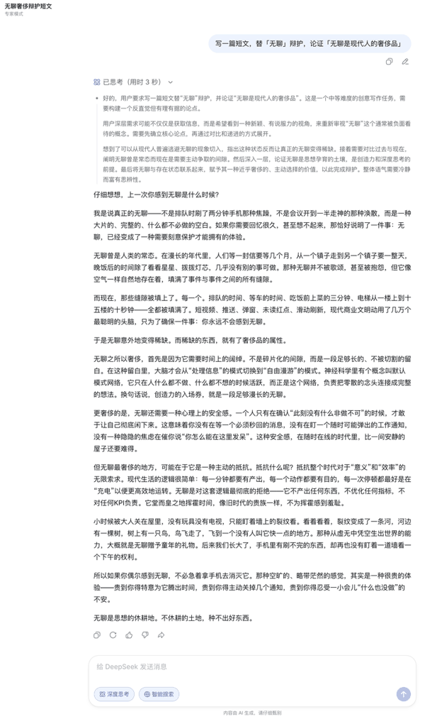 创意写作方面,我给两种模式出了一道辩论写作题,题目是「替无聊辩护,论证无聊是现代人的奢侈品」。专家模式的输出更长,逻辑链更完整;快速模式的文风则相对自然朴实。
