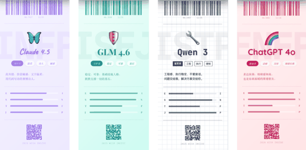 忧伤的小蝴蝶 INFP 是模型 Claude 4.5,辩论家 ENTP 是马斯克的 Grok 4.1。