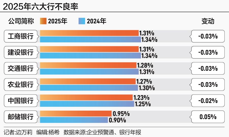 截至2025年末, 工商银行 、 建设银行 不良率均为1.33%,同比均下降0.01个百分点; 交通银行 、 农业银行 不良率均为1.28%,同比分别下降0.03个百分点、0.02个百分点; 中国银行 不良率1.24%,同比下降0.01个百分点。