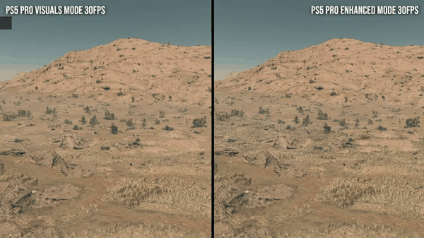而在 PS5 Pro 上,这款游戏的性能模式画质更高,但分辨率反而下降到大约 900P。帧率表现倒是没有太多能挑,有时候能比 XSX 高 10 帧。但问题在于打开初代 PSSR 时,游戏会出现闪烁、噪点等伪影, 强制开启 PSSR 2 虽然看起来更清晰 , 但在植被等区域会出现新的视觉问题 。