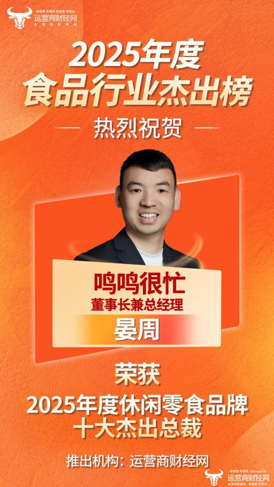 近日,运营商财经网正式公布“2025年度休闲零食品牌十大杰出总裁”名单,鸣鸣很忙董事长兼总经理晏周成功上榜!