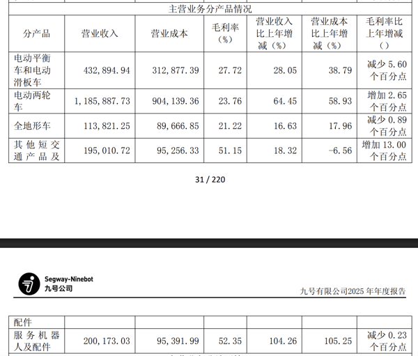 从销量来看,收入贡献最多的电动两轮车2025年年销量达409.03万辆,同比增长57.39%;电动平衡车及滑板车年销量为182.39万辆,同比增长16.13%;全地形车销量为2.67万辆,同比增长12.26%;服务机器人全年销量仅33.89万台,但实现同比翻倍增长(+105.63%),显示出其在海外市场的快速放量。此外,财报表示,截至2026年 1月,公司电动两轮车产品在国内市场累计出货量已突破1000万台。