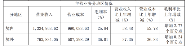 从地区市场来看,2025年境内收入为133.50亿元,毛利率为25.84%,同比增长58.48%,占总收入的62.74%;境外收入为79.28亿元,毛利率为36.01%,同比增长37.35%,占总收入的37.26%。