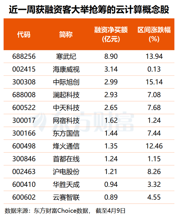 资金方面, 东方财富 Choice数据显示,近一周,共有31只云计算概念股获得千万元级融资净买入,其中, 寒武纪 获杠杆资金大幅加仓8.9亿元, 海康威视 、 中际旭创 、 澜起科技 、 中天科技 融资净买额分别在2.65亿至3.14亿元不等, 网宿科技 、 东方国信 、 沪电股份 等5股均获融资客超亿元抢筹。