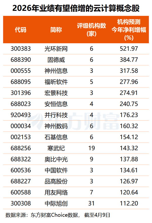 未来增长潜力方面,根据3家及以上机构一致预测,共30只云计算概念股今年业绩有望增逾五成,其中,机构预计 光环新网 今年净利将同比大增522%, 固德威 、 宏景科技 等5股均有望实现2倍以上净利增长, 石基信息 、 寒武纪 、 用友网络 、 中际旭创 等9股预测净利增幅均在110%以上。
