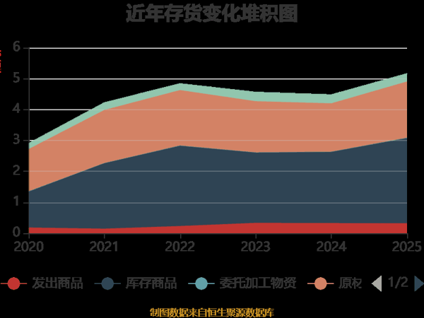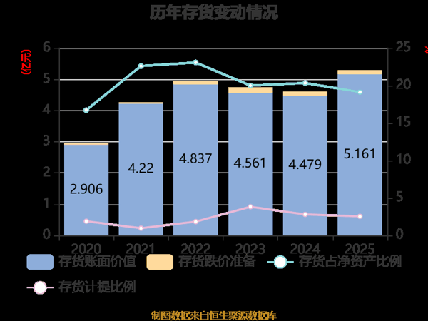 从存货变动来看,截至2025年末,公司存货账面价值为5.16亿元,占净资产的19.13%,较上年末增加6819.13万元。其中,存货跌价准备为1345.23万元,计提比例为2.54%。