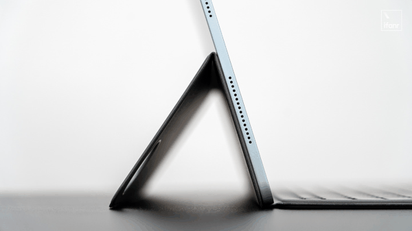 vivo 智能触控键盘 6 Pro 沿用了上侧下翻成支架的设计,底部 Popgo Pin 触点部分有足够的磁力,用户折下支架时就不会出现把键盘取下的尴尬。