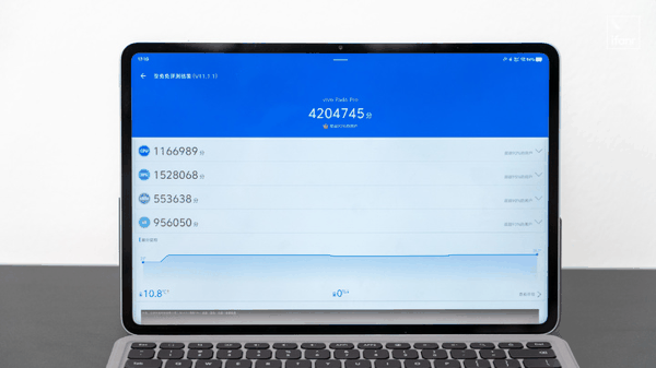 性能方面,vivo Pad6 Pro 在室内常温状态下开启性能模式,安兔兔跑分为 4204745。