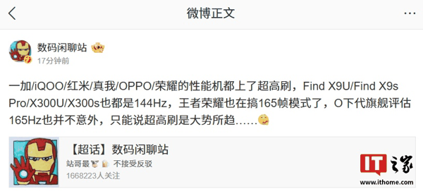 IT之家 4 月 7 日消息,博主 @数码闲聊站 今日发文称, 一加 / iQOO / 红米 / 真我 / OPPO / 荣耀的性能机都上了超高刷 。