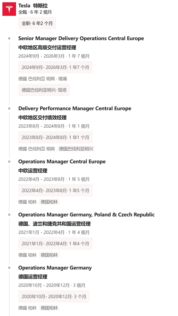 IT之家查询迪特 · 洛伦茨领英资料发现, 他曾在特斯拉担任中欧运营经理、德国运营经理、运营主管等多个岗位 。