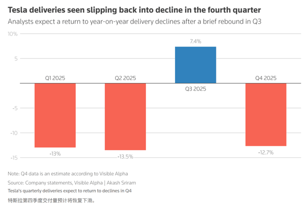 此外,该公司还面临新产品市场反响平平、更实惠车型推出缓慢等批评。尽管特斯拉于 2025 年第 3 季度在美国推出了两款畅销车型的低价版本以提振销量,但仍难以抵挡来自中国竞争对手日益激烈的攻势。