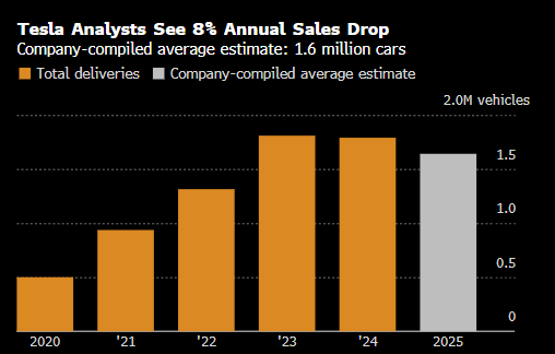 尽管特斯拉的投资者关系团队多年来一直在汇总交付量的平均预期,但此前并未在其投资者关系页面上公开这些数据。今年料将是这家汽车制造商连续第二年汽车销量下滑,其汇总的平均预期显示,全年交付量约为160万辆,同比下降逾8%。