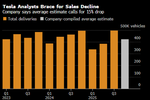 按特斯拉网站发布的统计,分析师平均预计该公司第四季度将交付422,850辆汽车,同比下降15%。相比之下,彭博汇编的平均预期为440,907辆,同比下降11%。