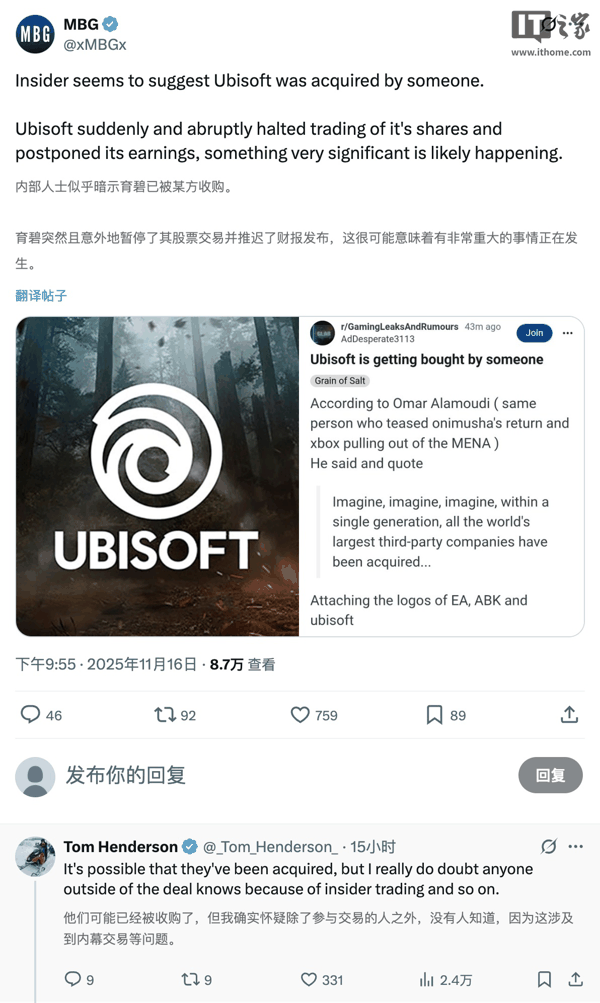 IT之家 11 月 17 日消息,昨天晚间,X 平台博主 MBG 发文称,内部人士“似乎暗示” 育碧已经被某方收购 。“育碧突然且意外地暂停了其股票交易并推迟了财报发布,这很可能意味着有非常重大的事情正在发生。”